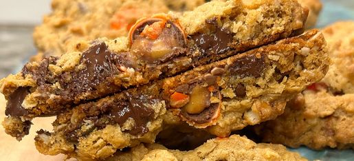 A Peanut Butter Oatmeal Cookie loaded with Milk Chocolate Chip, Reece’s Peanut Butter Chips, Reece’s Pieces, a mini Reece Peanut Butter Cup in the center and drizzled with Lindt Chocolate!!!