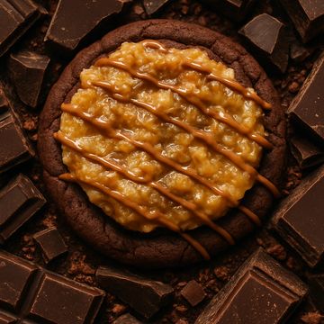 A rich, gooey, chocolate brownie like cookie with milk chocolate chips, a coconut pecan topping, drizzled with Lindt milk chocolate.